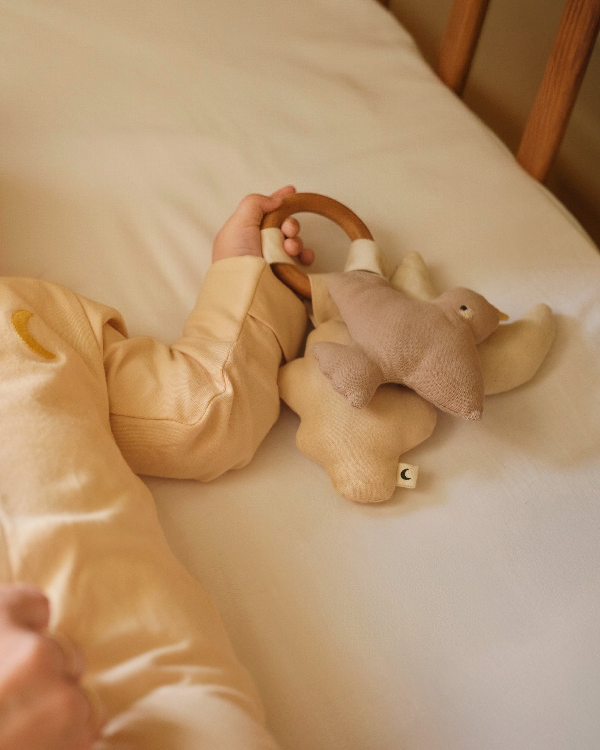 Each delicate character is securely attached to a baby-safe ring made from beautiful walnut wood, creating a stylish and comforting toy for your little one. Designed to bring comfort and soothe, this night toy provides a calming sensory experience that enhances bedtime rituals and offers reassurance during naps.